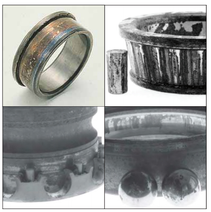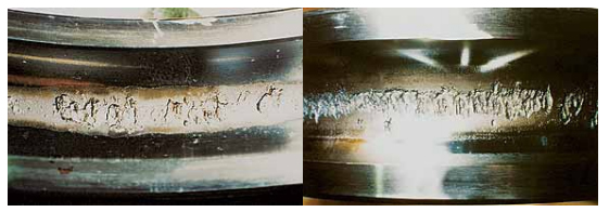 對稱位置剝落表現在內圈為周圍環帶剝落,而外圈呈周向對稱位置剝落(即橢圓的短 軸方向),其產生原因主要是因為軸承箱孔橢圓過大。當軸承壓入橢圓偏大的軸承箱孔中 時,使軸承外圈產生橢圓,在短軸方向的游隙明顯減少甚至負游隙。軸承在載荷的作用 下,內圈旋轉產生周向剝落痕跡,外圈只在短軸方向的對稱位置產生剝落痕跡,這是該 軸承早期試銷的主要原因。采取的對策是提高軸承箱孔加工精度。