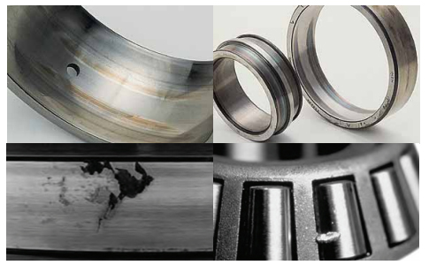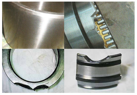 所謂卡傷是由于在滑動面損傷產生的部分的微小燒傷匯總而產生的表面損傷。滑道 面、滾動面圓周方向的線狀傷痕。滾子端面的擺線狀傷痕,靠近滾子端面的軸環面的卡 傷。造成卡傷的主要原因有:過大載荷、過大預壓、潤滑不良、異物咬入、內圈外圈的 傾斜、軸的撓度、軸、軸承箱的精度不良等。可以通過適當的預壓、改善潤滑劑和潤滑 方法、提高軸、軸承箱的精度來解決。